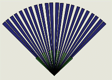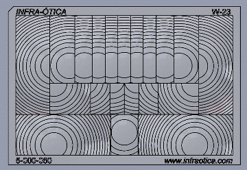 Displayed below is a preliminary pattern for a low profile lens. This lens is designed to cover a 90 degree angle to a distance of 20 meters. It is designed to work with a dual element pyroelectric device, positioned 23 mm behind the lens. |