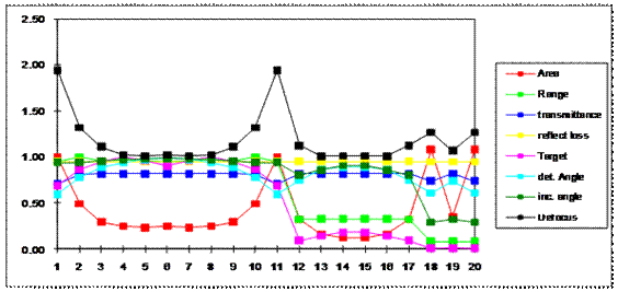 In the sketch above, S1 is the target, usually a person. S2 is the lens. The target, S1 is radiating Energy E1 into space. The distance between the target and the lens is R12. N1 and N2 represent the normal vectors to the surfaces of the target and the lens. The target and the lens can have different sizes, positions, and orientations. For simplicity we model humans as a simple rectangular block. More detail would be desired, but the computer model would get overly complex. This sketch and equation are placed inside a computer model and with this model we are able to calculate the Energy E2 that each lens in the array receives from the target. A second calculation is performed for the energy transfer from the lens to the detector. The layout and mathematics are similar, but the focusing power of the lens is considered in this model. Our computer model allows us to consider lens surface area, range and angle to the target, transmittance of the lens, reflectance of the lens, target area, incidence angle on the pyroelectric detector, and amount of defocus of the lens element. We can quickly arrange the elements so we use elements from the center of the master lens. The center portion of the lens has the greatest sensitivity. We can also model and identify other factors such as detector or lens tilt that will improve overall sensitivity. Due to the physical layout of a sensor, it is impossible to place each element at its precise focal distance from the pyro. This model allows us to select the focal lengths that will minimize defocus and maximize the overall sensitivity of the lens. Third Design Step– Balanced Sensitivity The end goal of our design cycle is balanced sensitivity. Once we have identified the features that will provide maximum sensitivity, we begin optimizing the lens to provide balanced sensitivity. We can make adjustments to the lens to balance the sensitivities between elements. The easiest change is to vary the size of the elements. This lets us compensate for reduced sensitivity due to range or angle by increasing the surface area of the element. We can adjust the detector tilt to compensate for the weakest set of zones. |